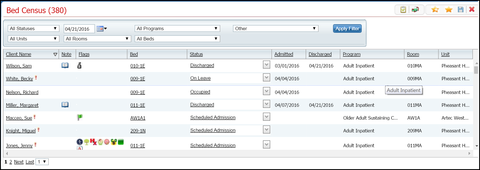 The Bed Census list page is displayed. The client's record now lists a status of Occupied. The line with a status of Discharged is no longer displayed.