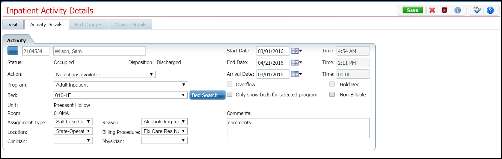 Note: You can only discharge a patient with a status of Occupied or On Leave.