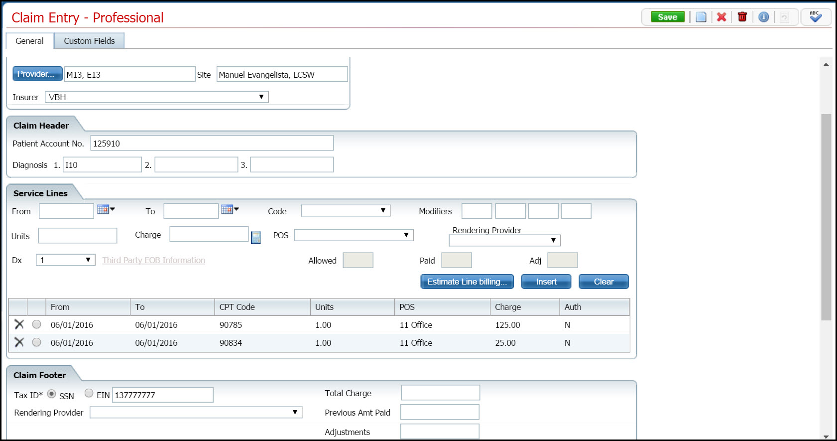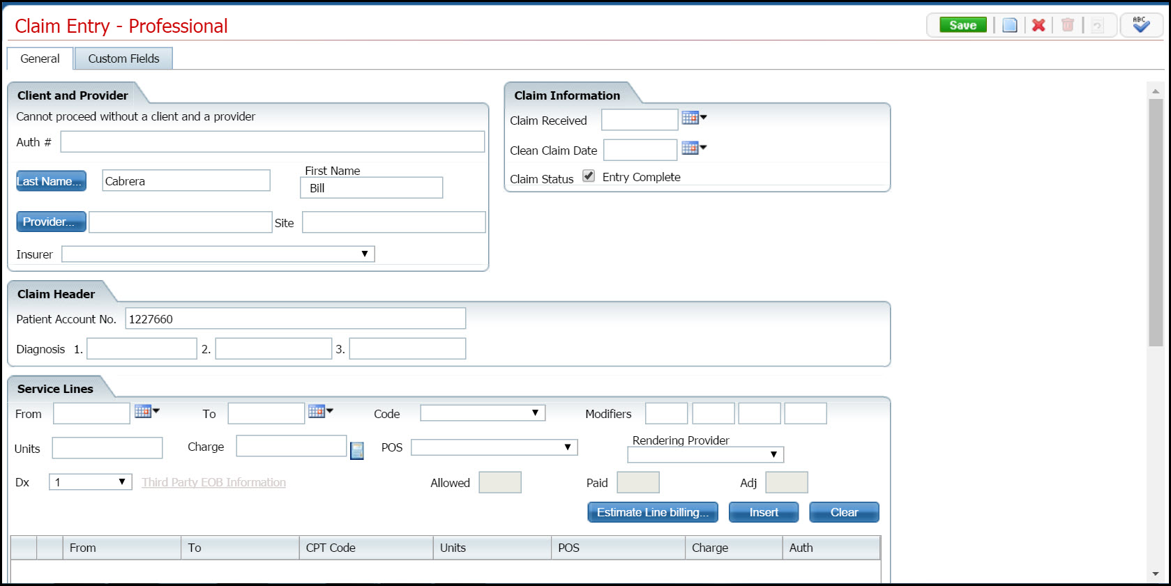 When the Claim Entry - Professional page is complete, click the Save button in the task bar.