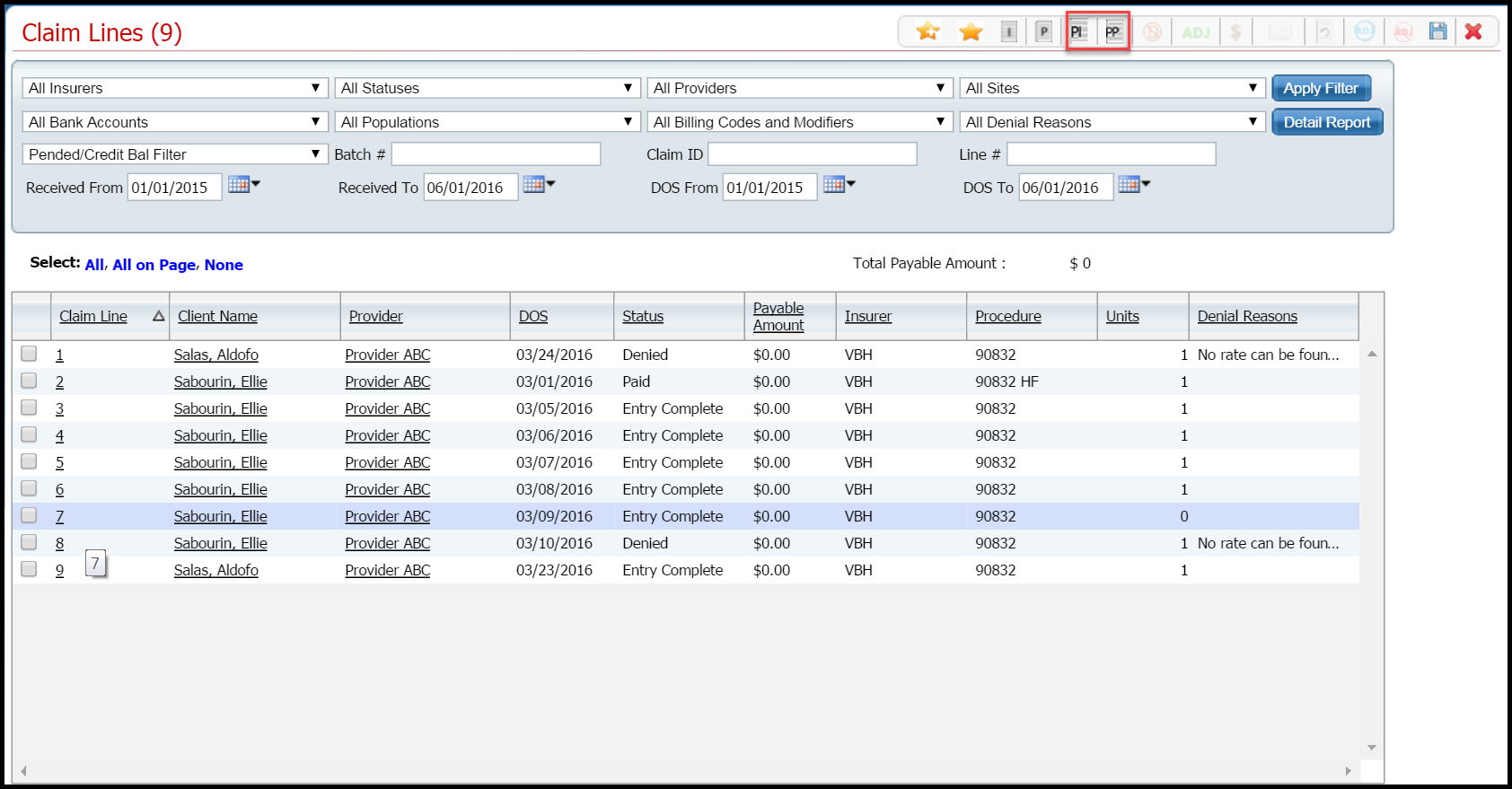 If you are provider organization who enters claims manually, use the Provider Institutional and Provider Professional icons on the task bar of the Claim Lines (###) list page.