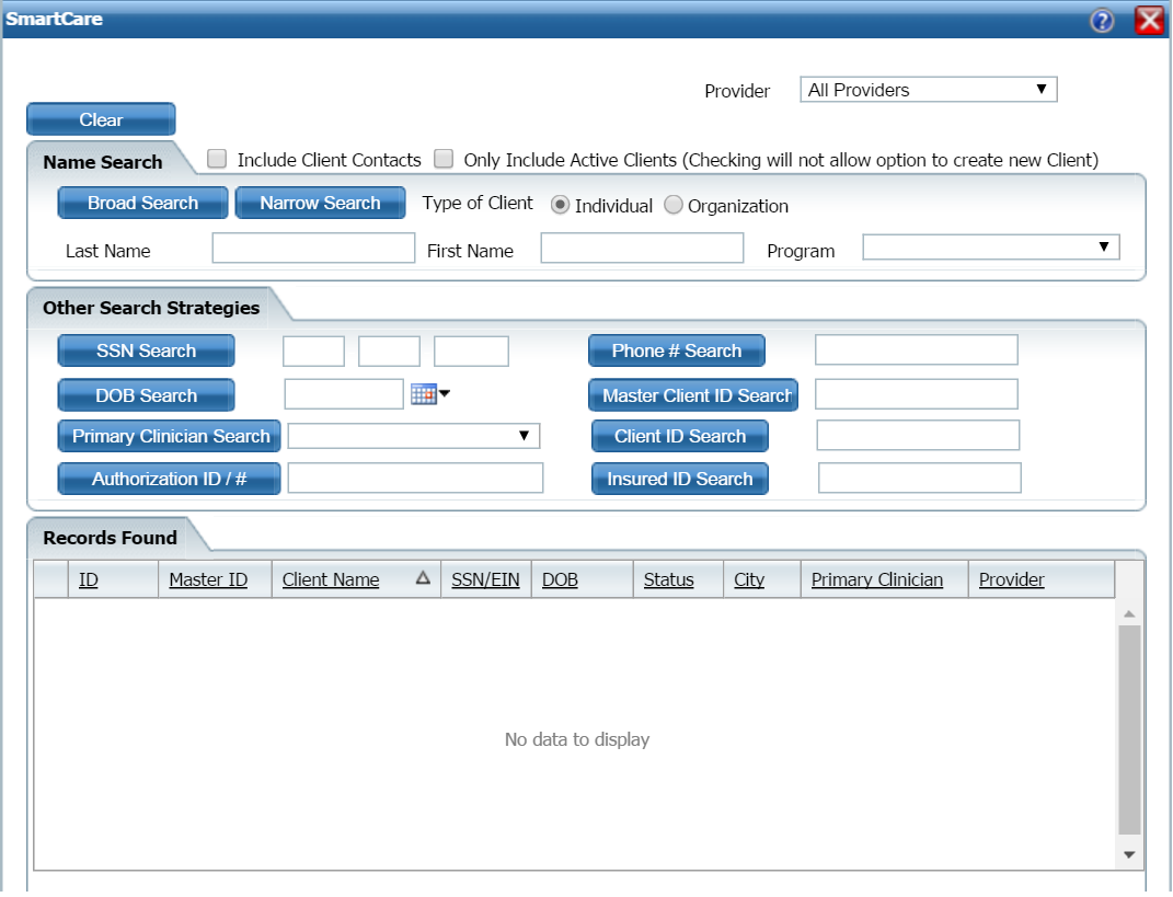 If no client account is open, the Client Search window is displayed. View field definitions.
