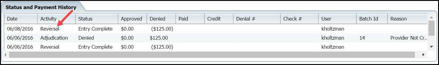 Notice in the Status and Payment History section, a record is displayed above the Activity record line of Adjudication with an Activity of Reversal. Refer to the red arrow in the screen image below.